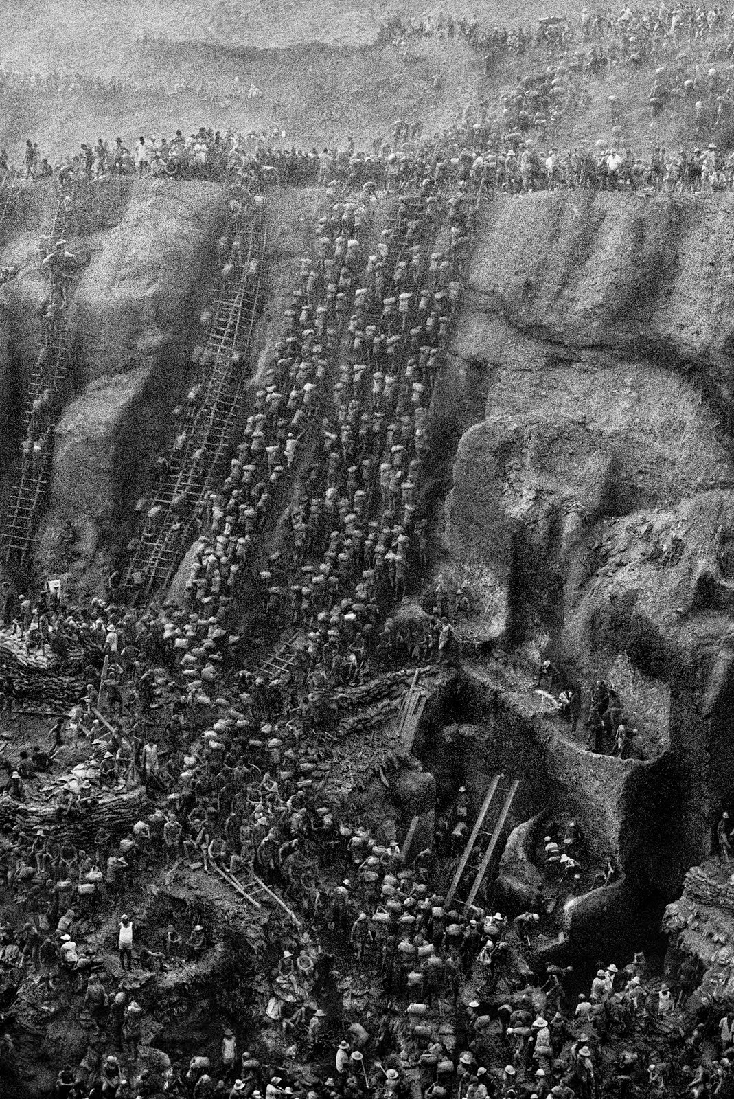 the enormity of the man-made mine, with carved-out hollows and terraces and long, rickety ladders leaning against its steep sides. The packed crowd of miners, shifting their loads of earth, appears to move as one, in a continuous flow, like ants.It is an evocative image.